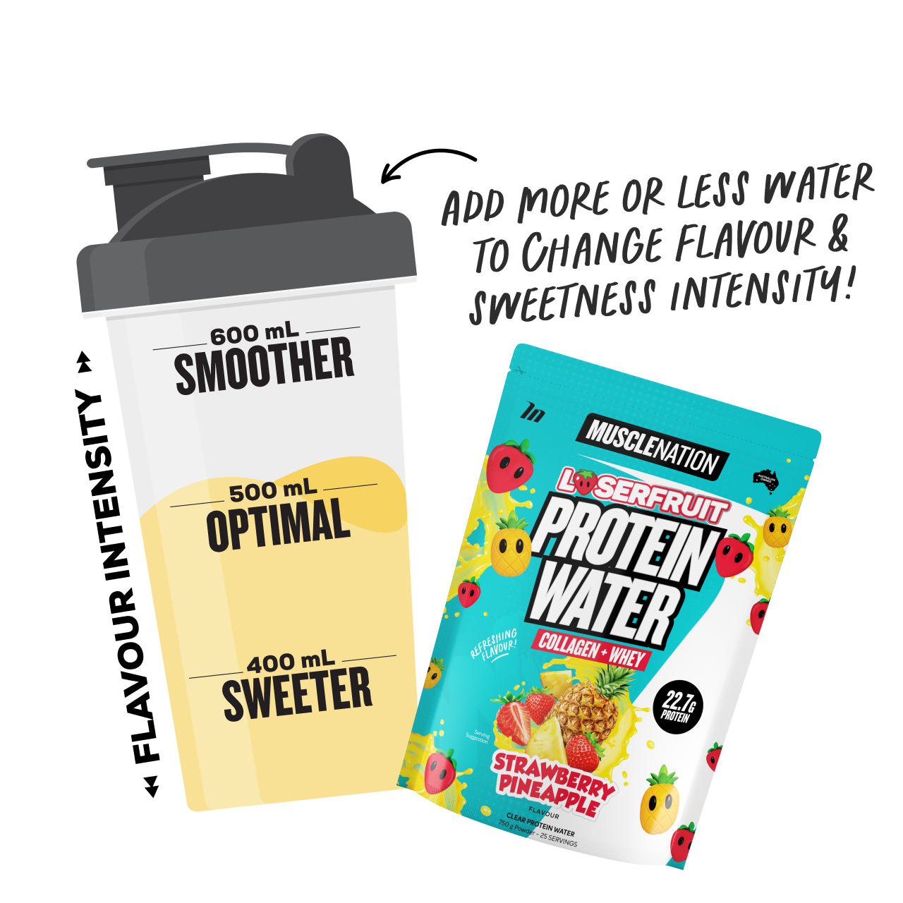 A refreshing clear protein water supplement which is a light alternative to the usual milky protein shake. With the benefits of protein, collagen, electrolytes and BCAA's, the Muscle Nation Protein Water is a fruity and thirst quenching drink to use any time of the day.