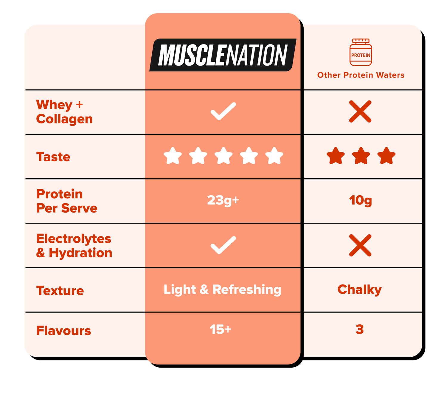 A refreshing clear protein water supplement which is a light alternative to the usual milky protein shake. With the benefits of protein, collagen, electrolytes and BCAA's, the Muscle Nation Protein Water is a fruity and thirst quenching drink to use any time of the day.