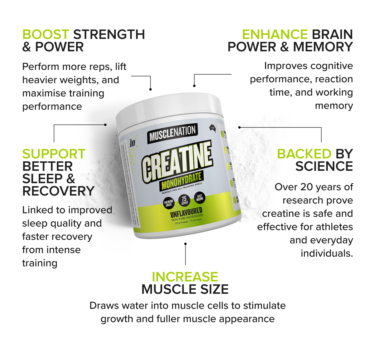 Creatine Monohydrate is a naturally occurring compound found in your muscles and brain. Supplementing with creatine helps your body regenerate ATP (adenosine triphosphate), the primary energy carrier in your cells.