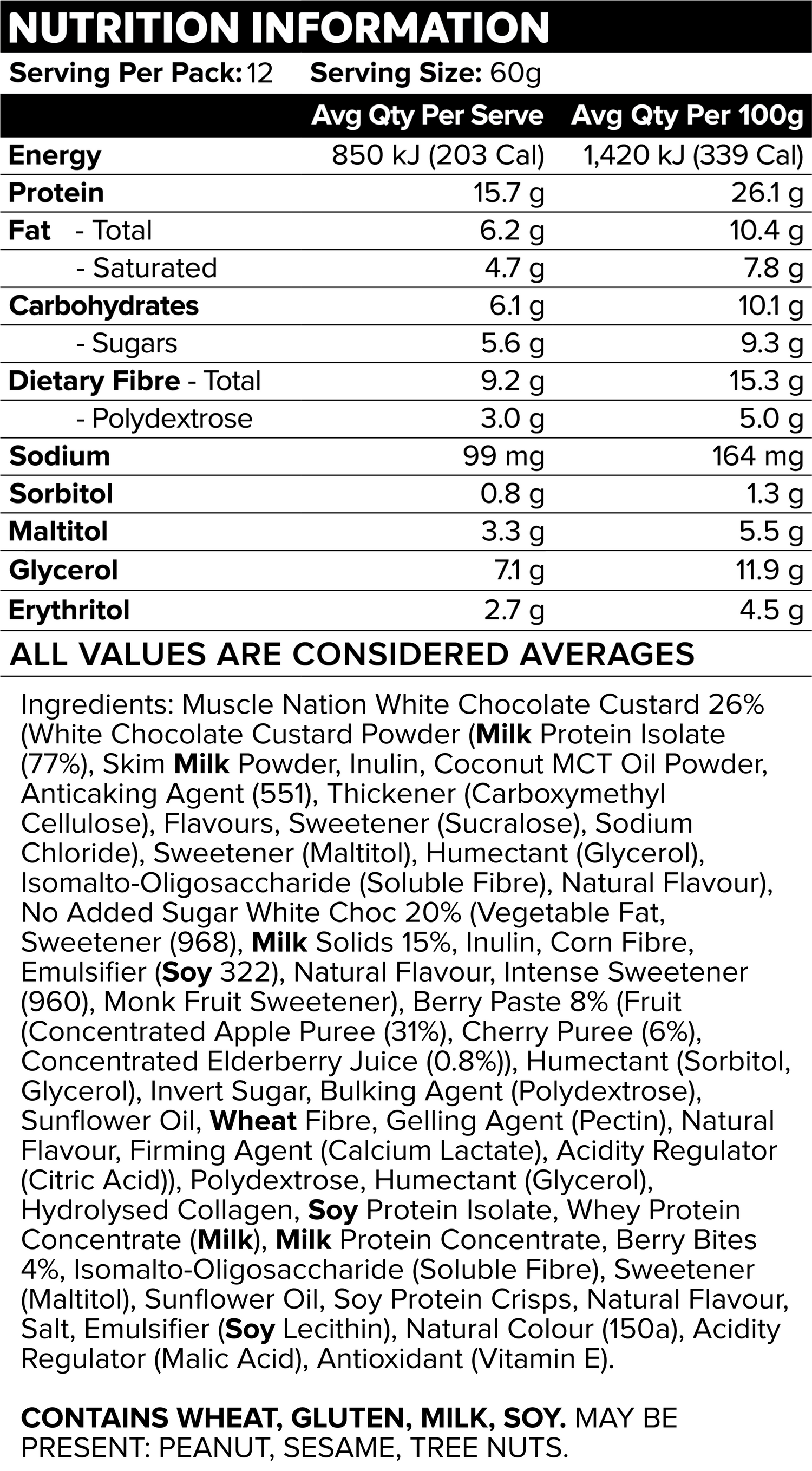 A mouth watering protein bar featuring a smooth white chocolate custard layer with an extra layer of gooey raspberry jam, sprinkled with chewy berry bites and coated in a lush layer of white chocolate.